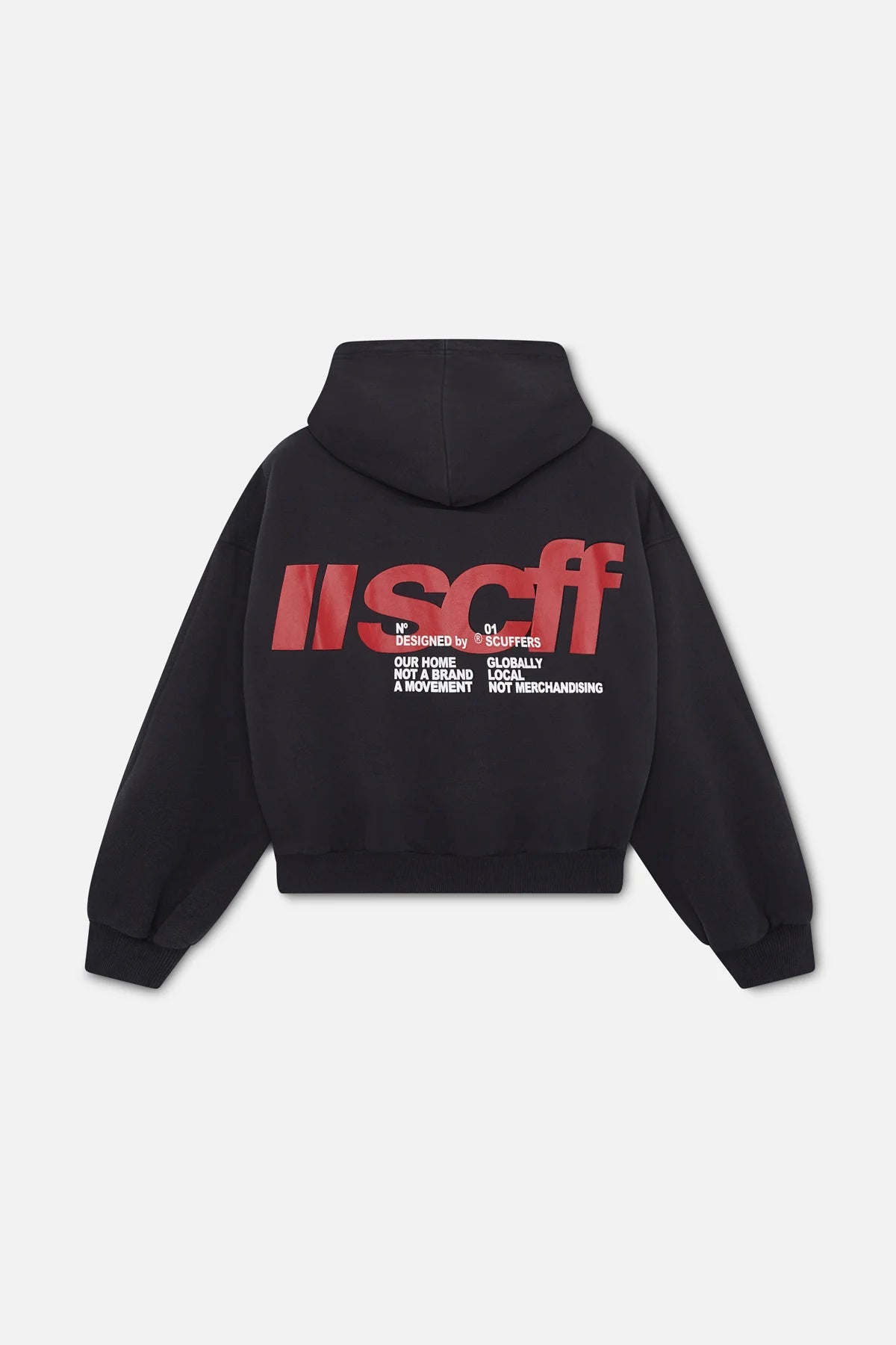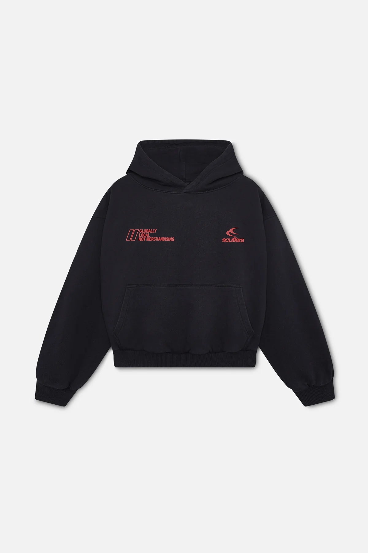 Capacidades negras unisex de gran tamaño de peso ultral-pesado. Logotipo de 'Scoffers Double Moon' impreso en pantalla y 'Local Globaly Local no Merchandising' en la parte delantera y logotipo 'SCFF' en la parte posterior; todos ellos en rojo.